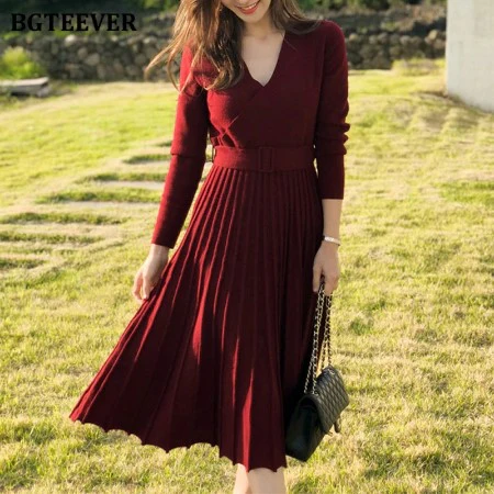 Here is an Elegant Overlap Sweater Dress by Blackbeads. This dress for women is perfect for autumn. The dress material is a natural fibre, giving it a knitted feel. This full-sleeved dress women features a V-neck and is mid-calf length and has an overlap, and a faux belt. The dress design also has pleats. Check out the dress photo for a more detailed look.