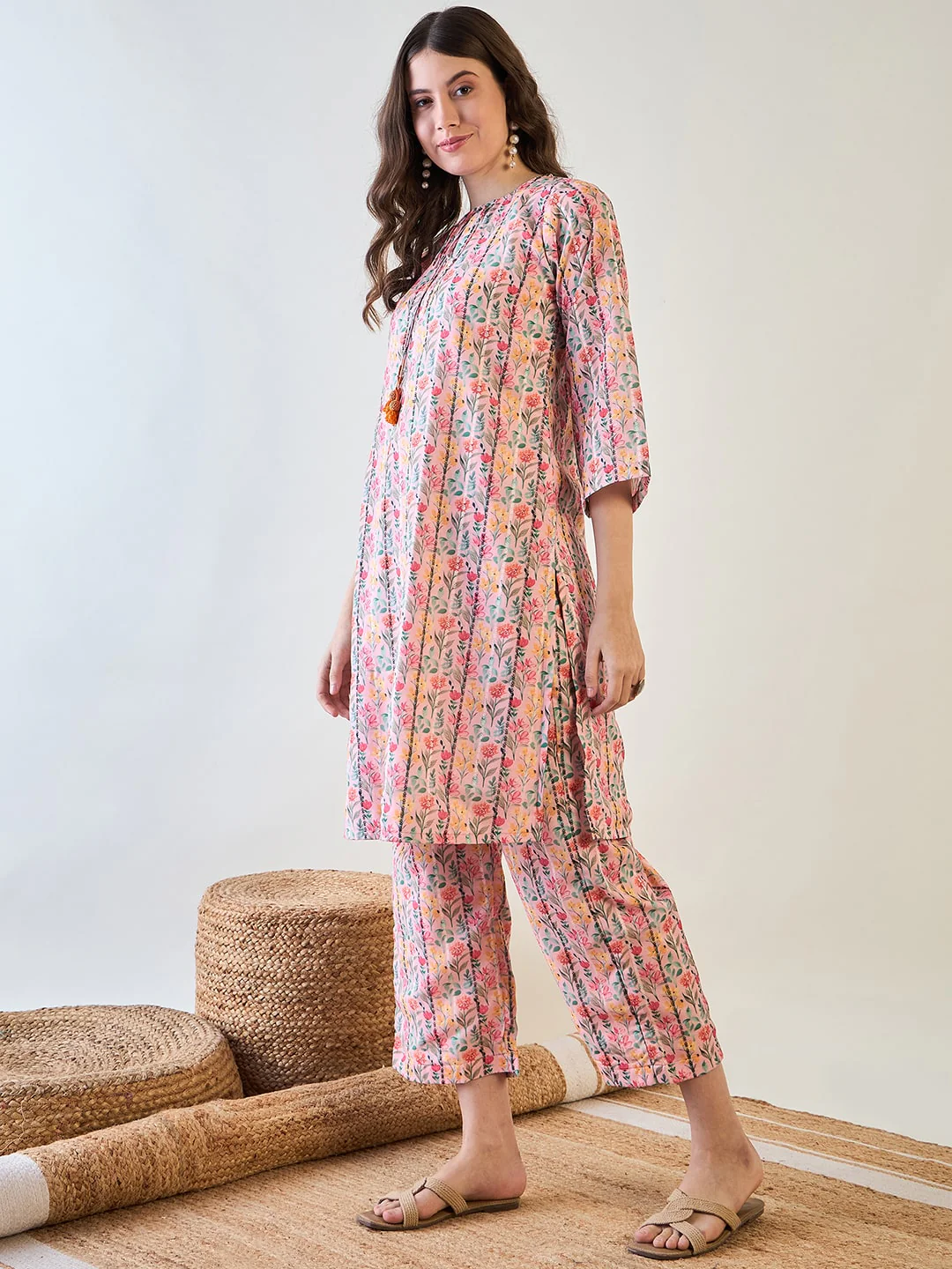 Shine In Style With Our Pink Floral Striped Lurex Co-Ord Set. Featuring A Chic Blouse And Matching Pants, Vibrant Floral Patterns, And Shimmering Lurex Stripes. The Beaded Tassel Detail On The Neck Dori Adds Elegance. Perfect For Festive Occasions Or Nights Out, Blending Elegance And Comfort Seamlessly.